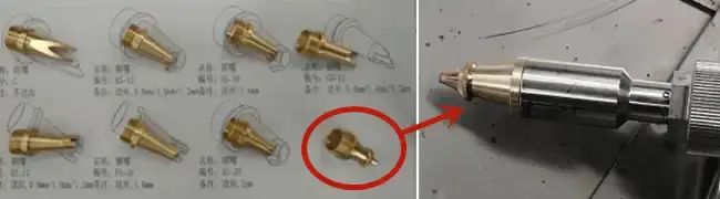 Our laser welder comes with a variety of nozzles, each designed for different applications. For laser cutting, it’s crucial to choose the specific nozzle intended for laser cutting purposes. Refer to the accompanying diagram to identify the correct nozzle.